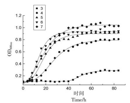 由圖2及表2可知,當(dāng)pH值為3時(shí),此時(shí)μmax為0.003 h-1,Lag為48.1 h;當(dāng)pH值增加至6時(shí),此時(shí)μmax最大,Lag最短,分別為0.019 h-1,11.7 h;當(dāng)pH值增加至7時(shí),μmax下降,Lag增加,其Nmax達(dá)到最大值。以上表示pH值在3~7范圍內(nèi),短乳桿菌均能生長,表現(xiàn)出良好的耐酸能力,當(dāng)pH值為6時(shí)短乳桿菌生長速率最大,能更好的啟動(dòng)發(fā)酵。