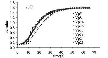 由表3及圖2修正的Gompertz的擬合結果可知,20℃時Vp 18菌株的生長最快,方差分析可知,與Vp5,Vp 8,Vp 14,Vp 2均存在顯著性差異(p<0.05)與Vp 16,Vp 17,Vp 21不存在顯著性差異(p>0.05),Vp 17次之,僅與Vp 2存在顯著性差異,Vp5生長最慢,但其僅與Vp 18有顯著性差異;8株菌的延滯期無顯著性差異(p>0.05);Vp2的最大生長量最大,但與Vp5沒有顯著性差異(p>0.05),與其他的菌株都有顯著性差異(p<0.05)。Vp18的最大生長量最小,與Vp2和Vp5有顯著性差異(p<0.05),與其他的菌株均無顯著性差異(p>0.05)。