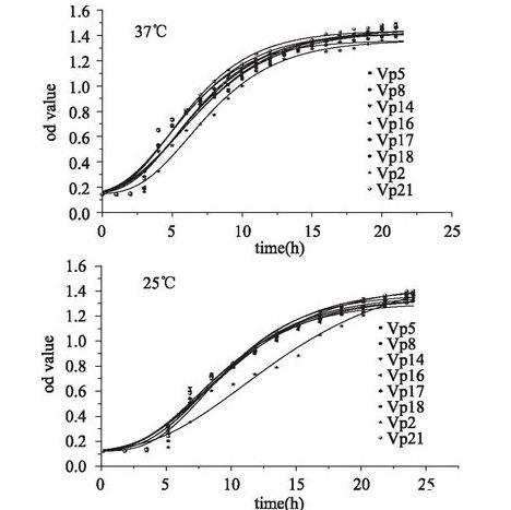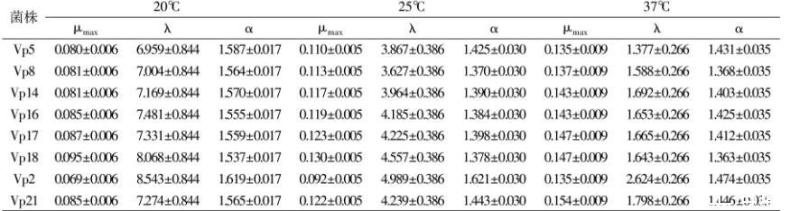37℃時8株菌的最大比生長速率無顯著性差異(p>0.05);Vp 2的延滯期最長,且與其他的菌株有顯著性差異(p<0.05),而其他幾株菌間無顯著性差異(p>0.05);Vp 2的最大生長量最大,與Vp 8和Vp 18存在顯著性差異(p<0.05),與其余菌株均無顯著性差異(p>0.05),Vp 18的最大生長量最少,與Vp 2和Vp 21存在顯著性差異(p<0.05),與其余菌株均無顯著性差異(p>0.05)。