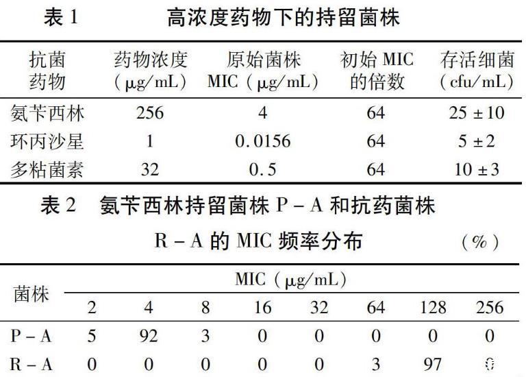 在藥物氨芐西林濃度為256μg/mL條件下,先后共收集存活的細(xì)菌134株,測定其MIC,90%以上的菌株與原始菌株持平,少數(shù)略高于原始菌株一個或兩個梯度,均遠(yuǎn)遠(yuǎn)低于其生存環(huán)境的藥物濃度。環(huán)丙沙星和多粘菌素作用下的群體也存在同樣的現(xiàn)象(數(shù)據(jù)略)。這些在高濃度藥物作用下存活的細(xì)菌,其MIC卻保持不變,為持留菌。致死量的抗菌藥物不能將其殺滅,說明持留菌通過某種機制耐過了高濃度的藥物,并且保持了原有的藥物敏感特性。隨機選取其中一株氨芐西林的持留菌,在氨芐西林濃度為256μg/mL的環(huán)境中得以存活,測定其分裂繁殖的后代實際MIC為4μg/mL,經(jīng)傳代后MIC保持不變,命名為菌株P(guān)-A,是原始菌株持留菌株繁殖后代的純培養(yǎng)。