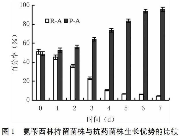 氨芐西林處理的P-A和R-A菌株MIC范圍無相互交叉,將二者等比例混合接種培養(yǎng),根據(jù)穩(wěn)定的MIC范圍統(tǒng)計其比例變化。如圖1所示,混合培養(yǎng)后,持留菌株P(guān)-A所占比例逐漸升高,到第4 d增至70%以上,至第7 d抗藥菌株R-A比例低于5%,菌株P(guān)-A數(shù)量占絕對優(yōu)勢。此結(jié)果表明,在沒有藥物的培養(yǎng)條件下,P-A具有更強的生長優(yōu)勢。隨機挑選氨芐西林作用下存活的其它持留菌株和抗藥菌株,用同樣的方法對比其生長優(yōu)勢,也有類似的結(jié)果(數(shù)據(jù)略)。另外兩種藥物環(huán)丙沙星和多粘菌素的持留菌株和抗藥菌株,生長優(yōu)勢的比較也存在類似結(jié)果(數(shù)據(jù)略),最終都能體現(xiàn)出持留菌株具有更強的生長優(yōu)勢。本研究中共檢測8組菌株的對比,未檢測到例外情況。