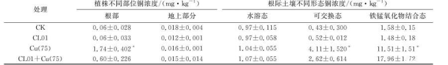(3)測定了根際土壤中水溶態(tài)、可交換態(tài)、鐵錳氧化物結合態(tài)的銅濃度,結果表明CL01菌株通過形成較高含量的鐵錳氧化物結合態(tài)銅,有效降低了土壤中水溶態(tài)和可交換態(tài)銅含量,減少了植物對銅的吸取量,降低了銅對植物的毒害作用。