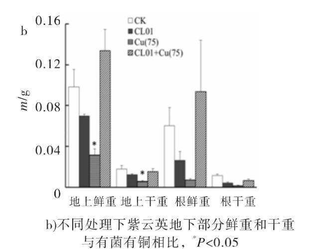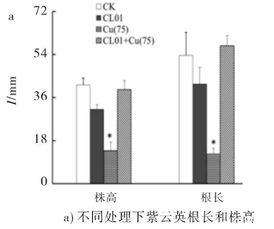 (2)在模擬銅污染土壤中種植紫云英,發(fā)現(xiàn)其具有較好的促進紫云英抵抗銅脅迫的作用。在含銅環(huán)境下,加菌處理植株地上部分高度、根長、植株鮮重,達到了無菌無銅處理下植株的生長水平,二者均顯著高于無菌有銅處理下植株。表明CL01能促進紫云英抵抗Cu的脅迫作用,提高紫云英的生長能力。
