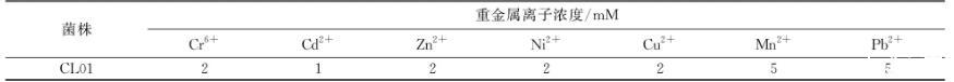 本實驗測定了CuSO4·5H2O,K2CrO4,CdCl2·2.5H2O,ZnSO4·7H2O,NiSO4,MnCl2·4H2O和Pb(C2H3O2)·3H2O等7種重金屬對CL01菌株的最低抑菌濃度(見表1)。結果表明:菌株CL01對不同重金屬離子的抗性各不相同,對鎘的抗性較弱,僅在含Cd2+濃度1 mmol/L的培養(yǎng)基上生長,而對Mn2+和Pb2+的抗性很強,其抗性濃度均達到了5 mmol/L.另外,菌株對Cr6+、Zn2+、Cu2+、Ni2+等重金屬離子的抗性濃度也均達到了2 mmol/L.對7種重金屬的抗性試驗分析表明,菌株CL01具有普遍較高的重金屬抗性能力。