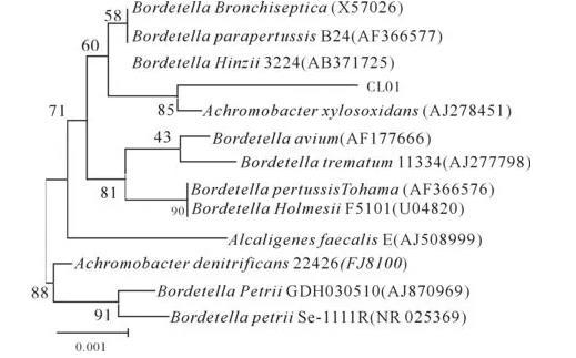 以菌株CL01的DNA為模板進行PCR,獲得一條約1.5 kb的特異性片度,經(jīng)回收、轉化后,挑選陽性克隆進行測序。利用Blast程序,將測序所得的16S rDNA部分序列和GenBank已登錄的16S rDNA序列進行核苷酸序列同源性比較,結果表明:菌株與Bordetella、Alcaligenes、Achromobacter等屬中多個種的16S rDNA序列具有高度同源性,與AchromobacterdenitrificansBMB-N6、AchromobacterxylosoxidansCONC18、B.bronchisepticaBb4、B.hinziiAU12584、Alcaligenesdenitrificans等菌的同源性均超過了99%。