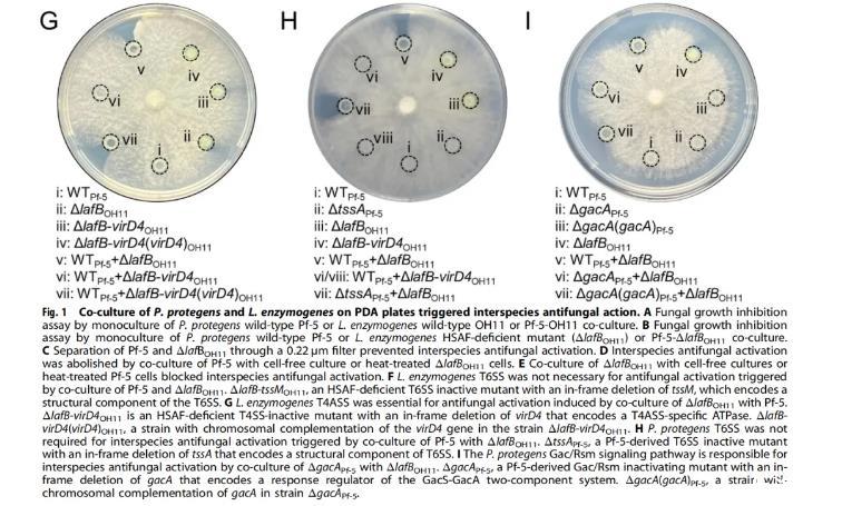 在這項研究中,我們展示了產(chǎn)酶溶桿菌通過其T4ASS激活假單胞菌蛋白原,從而抑制鄰近真菌的生長。我們通過在PDA瓊脂平板上共培養(yǎng)這兩種細菌以模擬細胞間接觸來實現(xiàn)這一點。結果表明了假單胞菌如何通過感知溶桿菌轉(zhuǎn)運的獨特T4E來抑制真菌。因此,我們發(fā)現(xiàn)了一種新的微生物種間和跨界相互作用模式,其中一種土壤細菌與另一種建立了種間相互作用以獲得效應蛋白,從而通過操控自身的抗真菌化合物抑制鄰近真菌的生長。我們的研究結果為擴展土壤中微生物相互作用的多樣性提供了一個獨特的案例。
