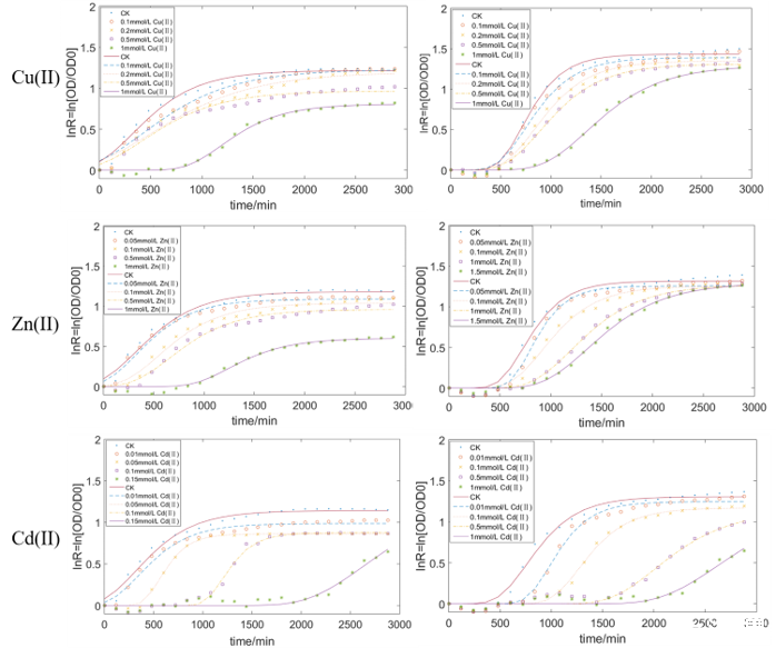 圖2、不同濃度Cu(II)、Zn(II)、Cd(II)、對(duì)大腸桿菌MG1655和活性污泥菌的劑量-響應(yīng)生長抑制曲線。