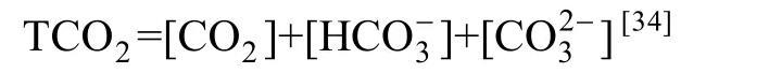 Toolan[32]指出庫(kù)倫呼吸測(cè)量法是基于碳的呼吸率,因而能與初級(jí)生產(chǎn)無(wú)機(jī)碳固定率作對(duì)比,并且由于其不需要運(yùn)用到呼吸熵,所以要比以測(cè)氧氣濃度變化為基礎(chǔ)的方法優(yōu)越。水體中由于CO2與23CO-相平衡,為了測(cè)量通過(guò)呼吸產(chǎn)生的CO2,故應(yīng)測(cè)量總?cè)芙鉄o(wú)機(jī)碳(TCO2):