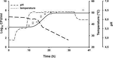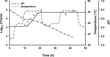 圖4、在周期性變化的溫度條件下儲存的淡奶中觀察到的(點(diǎn))和預(yù)測的(線)嗜熱脂肪芽孢桿菌ATCC 7953生長的比較2.不連續(xù)的線表示牛奶的pH值(---)和溫度變化(------)。