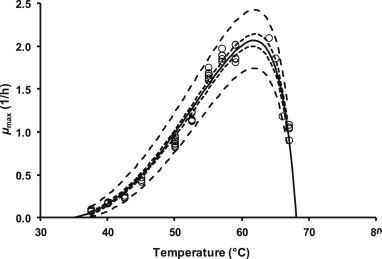圖1、溫度對嗜熱脂肪地芽孢桿菌ATCC 7953在胰蛋白胨大豆肉湯中的最大比生長速率(μmax)的影響,符合帶有拐點(diǎn)的基數(shù)模型(實(shí)線)(等式(1))。點(diǎn)(○)表示μmax的觀測值。虛線和不連續(xù)線分別描繪了溫度對最大比生長速率影響的95%置信度和預(yù)測限值。