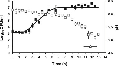 圖2、在最佳生長溫度(62°C)下儲存期間,源自煉乳(淡奶)中的孢子(■)和pH演變(□)的嗜熱脂肪芽孢桿菌ATCC 7953細(xì)胞的生長動力學(xué)。黑色實(shí)線(?)描繪了Baranyi和Roberts模型對增長數(shù)據(jù)的擬合。白點(diǎn)(○)表示觀察到的牛奶凝結(jié)時(shí)間。每個(gè)點(diǎn)是八個(gè)值的平均值。垂直和水平條表示標(biāo)準(zhǔn)偏差。