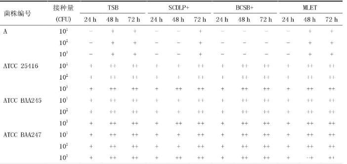 取2.1項下4株洋蔥伯克霍爾德菌的101、102、103菌懸液1 mL接種至各液體培養(yǎng)基中,每種濃度每種培養(yǎng)基制備1管,置32.5℃培養(yǎng),逐日觀察結果,必要時,劃線至TSA培養(yǎng)基培養(yǎng),以確認是否有菌生長。