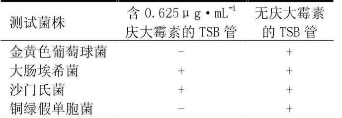 按2.3項下制備的含0.625μg/mL慶大霉素的TSB管,分別接種2.1項下金黃色葡萄球菌、大腸埃希菌、沙門氏菌及銅綠假單胞菌菌懸液各100μL,取無慶大霉素的TSB管接種相應試驗菌做為陽性對照管,置32.5℃培養(yǎng)48~72 h,用肉眼觀察其渾濁度,并記錄渾濁管數。