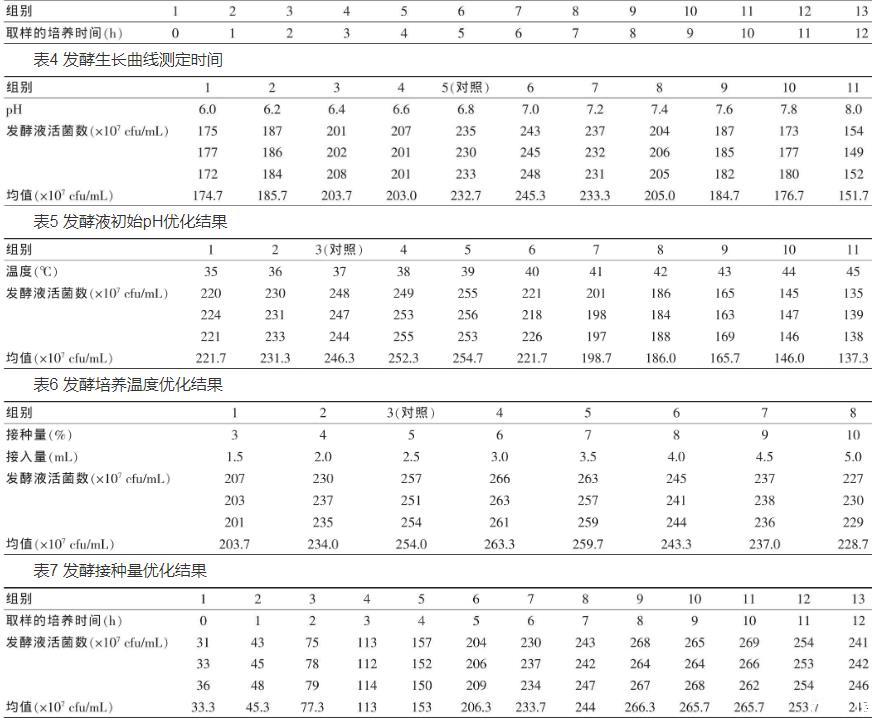 在發(fā)酵條件優(yōu)化過程中,筆者發(fā)現(xiàn)調(diào)節(jié)較低的初始pH會造成菌體初期生長過快,而縮短了對數(shù)生長期的生長,pH太高會造成菌體生長太慢,發(fā)酵液活菌數(shù)不高。在考察不同的培養(yǎng)溫度時,溫度太低或太高都不利于菌體的生長,溫度調(diào)節(jié)為39℃菌體生長較快,且發(fā)酵液活菌數(shù)較高,可能由于此溫度是菌體內(nèi)大多數(shù)酶的最佳作用溫度。在考察不同的接種量時,筆者發(fā)現(xiàn)接種量太低菌體生長過慢,菌體的適應(yīng)期延長,造成菌體生長狀況不好;而接種量太高時菌體生長過快,以至于菌體較早進入對數(shù)生長期,培養(yǎng)基中營養(yǎng)物質(zhì)利用太快,從而限制了菌體的進一步生長。