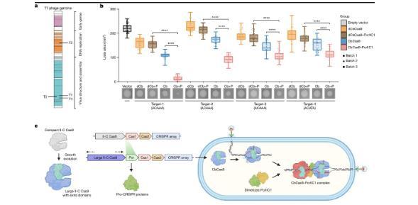 CRISPR系統(tǒng)是原核生物(如細菌)中的一種適應(yīng)性免疫系統(tǒng),能夠保護宿主細胞免受外來DNA的入侵,尤其是噬菌體的攻擊。研究者們鑒定了2,062個完整的Cas9位點,并預(yù)測了其相關(guān)蛋白的結(jié)構(gòu),揭示了II-C型Cas9的三種結(jié)構(gòu)生長軌跡。研究發(fā)現(xiàn)新的相關(guān)基因(NAG)通常存在于較大的II-C型Cas9的基因座內(nèi)。特別是來自金黃桿菌屬的CbCas9含有一個新的β-REC2結(jié)構(gòu)域,并與PcrIIC1蛋白形成異四聚體復(fù)合物。PcrIIC1蛋白是一種無毒的核酸酶,對單鏈DNA(ssDNA)和單鏈RNA(ssRNA)具有核酸酶活性,但其生物學(xué)作用與典型的PIN域毒素不同。CbCas9-PcrIIC1復(fù)合物表現(xiàn)出增強的DNA結(jié)合和切割活性,對原型間隔子相鄰基序(PAM)序列的更廣泛兼容性,對錯配的耐受性增強,從而提高了抗噬菌體免疫力。通過冷凍電鏡分析,研究者們揭示了CbCas9-PcrIIC1復(fù)合物的詳細結(jié)構(gòu),包括它們?nèi)绾螀f(xié)同作用于長dsDNA底物,以及如何通過雙重靶向來增強DNA干擾能力。研究提供了關(guān)于II-C型Cas9蛋白從緊湊到大型的進化生長軌跡的新視角,并探討了這些進化趨勢與細菌宿主的進化關(guān)系。PcrIIC1蛋白的發(fā)現(xiàn)不僅增進了研究人員對細菌免疫機制的理解,而且為CRISPR-Cas9系統(tǒng)在生物技術(shù)和醫(yī)學(xué)中的應(yīng)用提供了新的可能性,尤其是在提高基因編輯精度和適應(yīng)性方面。研究運用了多種先進的生物信息學(xué)工具和實驗技術(shù),如AlphaFold2結(jié)構(gòu)預(yù)測、冷凍電鏡(cryo-EM)和單分子熒光共振能量轉(zhuǎn)移(smFRET)等,來揭示Cas9蛋白的結(jié)構(gòu)和功能。本項研究不僅在結(jié)構(gòu)水平上揭示了II-C Cas9蛋白的多樣性,而且鑒定了PcrIIC1這樣的新型CRISPR相關(guān)蛋白,為理解CRISPR-Cas系統(tǒng)的進化和功能提供了重要信息,并為未來的生物技術(shù)應(yīng)用奠定了基礎(chǔ)。