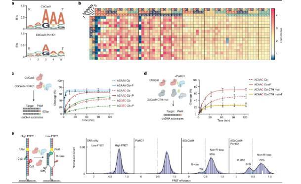 圖3、PcrIIC1增強CbCas9的體外DNA干擾活性。a,CbCas9和CbCas9-PcrIIC1 PAM偏好的WebLogo圖。數(shù)據(jù)代表具有相似結(jié)果的三個獨立實驗。b,熱圖顯示CbCas9-PcrIIC1和CbCas9之間PAM偏好的倍數(shù)變化。與CbCas9組相比,較暖的顏色表明CbCas9-PcrIIC1組對PAM的偏好增加。c,CbCas9和CbCas9-PcrIIC1效應(yīng)子對含有各種PAM(ACAAA、ACAAC和ACGTC)的靶dsDNA進行體外切割的模型(左)和效率圖(右);在0、2、5、15、30、60、90和120分鐘時收集等分試樣。數(shù)據(jù)為平均值±標準差(n=3個獨立重復(fù))。CbCas9的每個PAM的平臺值分別為66.88、46.98和26.77,CbCas9-PcrIIC1的每個PAM的平臺值分別為71.84、65.37和53.15。Cb和Cb+P分別表示CbCas9和CbCas9-PcrIIC1效應(yīng)子。d,使用CbCas9和CTH突變的CbCas9(CbCas9-CTH mut;K1431E、K1433E、K1435E和R1442E)使用ACAAC PAM對目標dsDNA進行的模型(左)和切割效率圖(右),在有或沒有PcrIIC1的情況下孵育;在0、2、5、15、30、60、90和120分鐘時收集等分試樣。數(shù)據(jù)為平均值±標準差(n=3個獨立重復(fù))。Cb-CTH mut和Cb-CTH mut+P分別表示CTH突變的CbCas9和CTH突變的CbCas9-PcrIIC1效應(yīng)子。e,左圖,用于目標dsDNA的R環(huán)形成的smFRET測定示意圖,其中TS上有Cy3標記,NTS上有Cy5標記。右圖為僅DNA、PcrIIC1、dCbCas9和dCbCas9-PcrIIC1樣品的FRET直方圖。