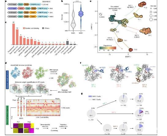 圖1、大型II-C Cas9與鄰近的NAG相關(guān)并表現(xiàn)出結(jié)構(gòu)生長軌跡。a)示意圖顯示已識別的II-A、II-B、II-C型和NAG相關(guān)II-C系統(tǒng)的CRISPR-Cas9系統(tǒng)的數(shù)量。顯示了GEM和HBGC數(shù)據(jù)集中已識別系統(tǒng)的數(shù)量。b)具有(NAG+)和不具有(NAG?)NAG的II-C Cas9的蛋白質(zhì)大小的比較。NAG+的中值為1,463個氨基酸,NAG?的中值為1,159個氨基酸。使用雙邊檢驗進行統(tǒng)計分析,并通過曼-惠特尼U檢驗確定顯著性。c)所有已識別的NAG的功能注釋。具有核酸結(jié)合功能的NAG呈紅色。d)示意圖顯示了II-C Cas9結(jié)構(gòu)預(yù)測、量化和降維分析的工作流程。PCA,主成分分析。e)II-C Cas9s蛋白質(zhì)結(jié)構(gòu)的SGT分析平面。點的大小對應(yīng)于Cas9的大小,顏色對應(yīng)于SGT的偽時間。每個簇的標簽根據(jù)軌跡著色。f)每個軌跡的高級簇中的代表性Cas9結(jié)構(gòu)。NAG+Cas9的比例標記在頂部,不同簇中Cas9的總數(shù)標記在每個簇的底部。