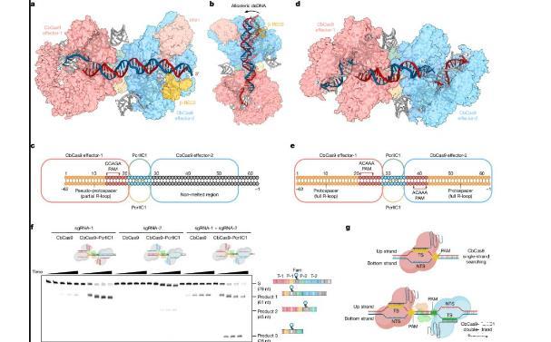 圖4:CbCas9-PcrIIC1復(fù)合物通過兩個CbCas9效應(yīng)子增強dsDNA篩選和dsDNA入侵能力。a,CbCas9-PcrIIC1-sgRNA-dsDNA非靶向復(fù)合物的結(jié)構(gòu)。蛋白質(zhì)以半透明冷凍電鏡圖顯示,核酸以原子模型顯示。b,a中CbCas9-PcrIIC1非靶向復(fù)合物的側(cè)視圖。B型DNA模擬物顯示為半透明模型。c,非靶向復(fù)合物中CbCas9-PcrIIC1與dsDNA靶標結(jié)合的示意圖。d,CbCas9-PcrIIC1-sgRNA-dsDNA(對稱20-nt互補)雙靶向復(fù)合物的結(jié)構(gòu)。蛋白質(zhì)以半透明冷凍電鏡圖顯示,核酸以原子模型顯示。e,雙靶向復(fù)合物中CbCas9-PcrIIC1結(jié)合dsDNA靶標的示意圖。f,含有兩種不同原型間隔子(原型間隔子-1(紅色)和原型間隔子-2(藍色)的Fam標記的靶dsDNA的體外切割。右下角是不同裂解產(chǎn)物的圖表。g,示意圖顯示CbCas9的單鏈搜索和CbCas9-PcrIIC1復(fù)合物的雙鏈搜索。