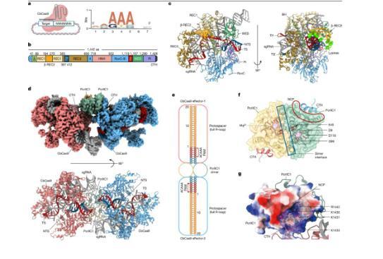 圖2、CbCas9三元和CbCas9-PcrIIC1四元復(fù)合物的冷凍電鏡結(jié)構(gòu)。a)CbCas9 PAM偏好。左圖是隨機質(zhì)粒去除測定的示意圖。右圖是CbCas9 PAM偏好的WebLogo圖。數(shù)據(jù)代表具有相似結(jié)果的三個獨立實驗。b)CbCas9域組織的示意圖。c)根據(jù)b著色的完整R環(huán)(左)和部分R環(huán)(右)CbCas9三元復(fù)合物(CbCas9-sgRNA-dsDNA)的原子模型。HNH和CTH是無序的,不包含在兩個模型中。β-REC2中潛在的DNA結(jié)合賴氨酸殘基在部分R環(huán)CbCas9三元復(fù)合物中用綠色球體標記。d)CbCas9–PcrIIC1–sgRNA–dsDNA四元復(fù)合物(28 bp dsDNA底物)的冷凍電鏡圖(頂部)和原子模型(底部)。e)由兩個對稱CbCas9-PcrIIC1效應(yīng)子結(jié)合的兩個dsDNA底物(20-nt互補)的卡通圖。f)PcrIIC1二聚體和兩個CTH結(jié)構(gòu)域的原子模型,以及PcrIIC1和Mg 2+離子的冷凍電鏡圖(半透明)。與活性口袋中的Mg 2+相互作用的殘基以紅色顯示。g)描述CbCas9的CTH結(jié)構(gòu)域和PcrIIC1的NCP之間結(jié)合的局部結(jié)構(gòu)模型。