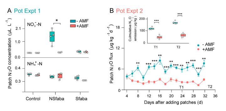 圖2:在沒有AMF(-AMF)或有AMF(+AMF)的情況下,斑塊的N2O排放。