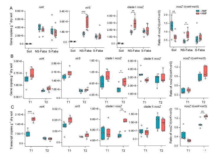 圖3:在沒有或存在AMF的情況下,nirK,nirS,nosZ(I族和II族)的基因和轉(zhuǎn)錄拷貝,以及在沒有或有AMF的情況下的nosZ I/(nirK+nirS)比例