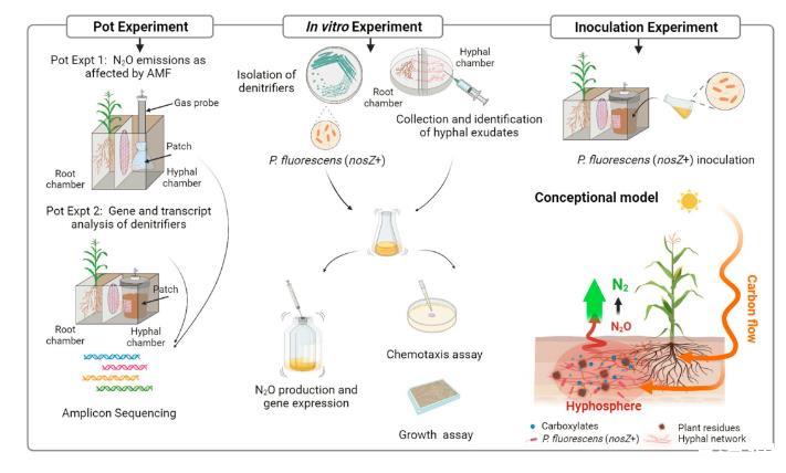 該研究包括幾個實(shí)驗(yàn):兩個盆栽實(shí)驗(yàn),體外實(shí)驗(yàn)和一個接種實(shí)驗(yàn)。兩個盆栽實(shí)驗(yàn)(盆栽實(shí)驗(yàn)1和2)測試了AMF向殘留物微位點(diǎn)的增殖是否可以減少N2O排放并分解調(diào)節(jié)途徑。我們還測試了菌絲層中微生物組的豐度;體外實(shí)驗(yàn)評估熒光假單胞菌與AMF共定植對降低N2O的重要性排放。我們分離了反硝化劑,并確定了菌絲滲出物的關(guān)鍵成分。然后我們檢查了趨化性,生長,N2O在體外培養(yǎng)條件下響應(yīng)AMF滲出物和關(guān)鍵化合物的熒光假單胞菌的發(fā)射和反硝化基因表達(dá);最后,接種實(shí)驗(yàn)驗(yàn)證了AMF或AMF滲出的檸檬酸鹽對N2O的影響熒光假單胞菌在盆栽中的發(fā)射和nosZ基因表達(dá)。使用概念模型來說明AMF與熒光假單胞菌相互作用以減輕N2O的途徑生產(chǎn)。
