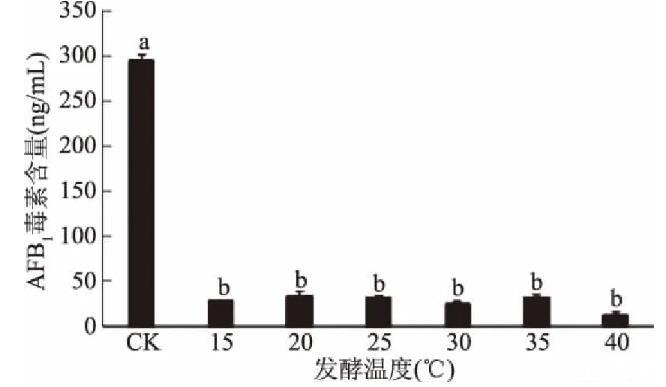 由圖9可知,在10℃時wt16菌株會變性,菌液變粘稠,無法離心制備wt16菌株的發(fā)酵上清液,在45℃時wt16菌株不生長。實(shí)驗(yàn)結(jié)果發(fā)現(xiàn),對照組毒素含量為(294.71±6.65)ng/mL,在40℃培養(yǎng)時wt16發(fā)酵上清液對黃曲霉73菌的產(chǎn)毒抑制率最高,其毒素含量為(11.61±4.04)ng/mL,對黃曲霉73菌的產(chǎn)毒抑制率達(dá)96.1%,其余溫度毒素含量差異性不顯著(p>0.05),因此wt16培養(yǎng)溫度在15~40℃均可。