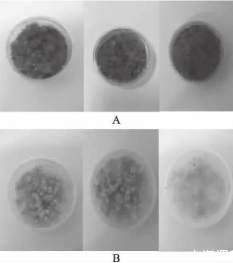 圖3 wt16在花生粉上對黃曲霉生長的影響注:(A)為經(jīng)由黃曲霉菌73侵染的花生粉;(B)為黃曲霉菌73與wt16共培養(yǎng)的花生粉。