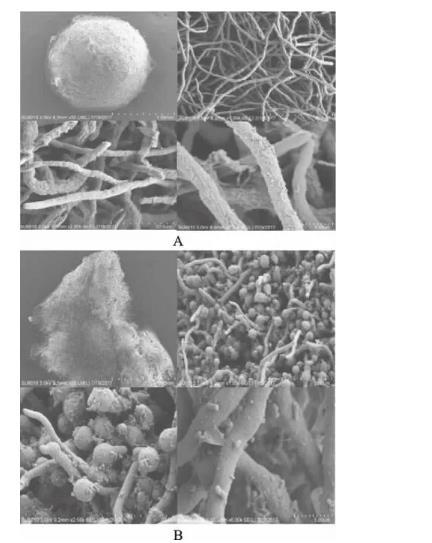 注:(A)為黃曲霉73菌絲體在掃描電鏡下放大100×、2000×、5000×、20000×的形態(tài)圖;(B)為與wt16菌株作用過后的黃曲霉73菌絲體在掃描電鏡下放大100×、2000×、5000×、20000×的形態(tài)圖。