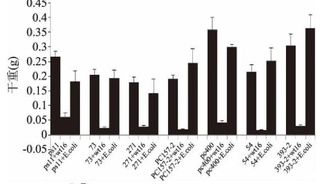 由圖1可知,在沙氏液體培養(yǎng)基中,與對照組相比,非脫羧勒克菌wt16菌株能使不同地區(qū)黃曲霉菌絲干重明顯降低,其抑制率最低為77%,最高為92%,而與對照菌株大腸桿菌共培養(yǎng)的不同地區(qū)黃曲霉菌菌絲干重并未明顯降低,表明wt16能有效抑制不同地區(qū)黃曲霉菌的生長。