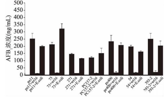 由圖2可知,在沙氏液體培養(yǎng)基中,與對照組相比,非脫羧勒克菌wt16菌株能使不同地區(qū)黃曲霉菌合成的毒素明顯降低,其抑毒率最低為90%,最高為96%,而與大腸桿菌共培養(yǎng)的不同地區(qū)黃曲霉菌產(chǎn)毒并未明顯降低,表明wt16能有效抑制不同地區(qū)黃曲霉菌的產(chǎn)毒。