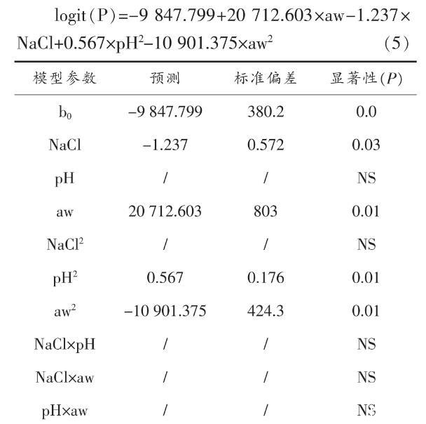 logit(P)=-9 847.799+20 712.603×aw-1.237×NaCl+0.567×pH2-10 901.375×aw2