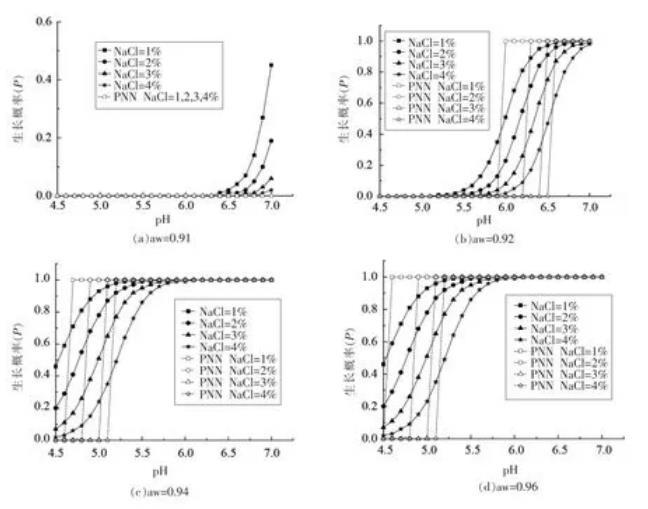 圖2中PNN人工神經(jīng)網(wǎng)絡(luò)預(yù)測(cè)結(jié)果(虛線),與Logistic模型預(yù)測(cè)曲線結(jié)果相似,生長/非生長0,1分界點(diǎn)在Logistic模型預(yù)測(cè)曲線中位于生長概率0.5附近,將生長概率<0.5的情況視作不生長,無法觀測(cè)到水分活度0.91時(shí),pH大于6.5之后的生長概率變化,實(shí)際生長概率有小幅上升趨勢(shì)。aw0.92時(shí),鹽分1%~4%條件下,分別在pH=6.0,6.3,6.4,6.5處出現(xiàn)拐點(diǎn),生長概率預(yù)測(cè)值由0變?yōu)?;aw0.94,0.96變化趨勢(shì)與實(shí)線相似。