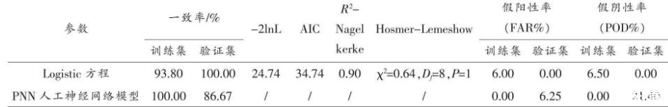 PNN人工神經(jīng)網(wǎng)絡(luò)模型訓(xùn)練集一致率為100%,驗(yàn)證集FC為86.67%,但驗(yàn)證集的FAR比Logistic模型高出6.25%。PNN人工神經(jīng)網(wǎng)絡(luò)模型能短時(shí)間內(nèi)對(duì)生長/非生長數(shù)據(jù)進(jìn)行快速分類,且總體準(zhǔn)確率較高,但僅能對(duì)生長/非生長數(shù)據(jù)進(jìn)行分類,無法準(zhǔn)確給出生長/非生長界面,僅能輸出生長概率0和1的數(shù)值,即無法給出具體細(xì)致的生長概率,但其快速分類功能可為工業(yè)生產(chǎn)提供便利。對(duì)大腸埃希氏菌(Escherichia coli R31)生長/非生長研究顯示,同一組內(nèi)基于PNN的模型比基于FEBANN(Feedforward error backpropagation artificial neural networks)的模型更精確,且基于二階logistic回歸模型比線性模型更準(zhǔn)確,而處理分類問題時(shí)PNN人工神經(jīng)網(wǎng)絡(luò)模型更優(yōu)。可能由于研究對(duì)象的差異,本文基于PNN人工神經(jīng)網(wǎng)絡(luò)模型的驗(yàn)證集準(zhǔn)確率低于Logistic模型。兩種模型擬合優(yōu)度和預(yù)測(cè)力比較如表3所示。