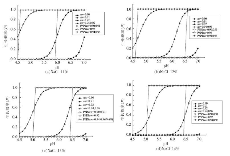 鹽分3.0%和4.0%時(shí),實(shí)線顯示aw 0.91時(shí),生長概率分別在pH 6.7和6.9時(shí)開始增大,最終到達(dá)0.06和0.02。鹽分越高,pH與aw的交互作用逐漸加強(qiáng),腐敗希瓦氏菌不適宜生長,生長界限開始變化點(diǎn)趨于高pH范圍,高鹽分對(duì)腐敗希瓦氏菌有生長抑制作用,其趨勢(shì)與虛線相同。