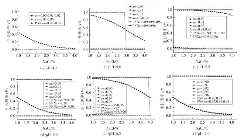 2.2.3 pH值對(duì)腐敗希瓦氏菌生長概率的影響圖3(a~f)為pH=4.5~7.0時(shí),腐敗希瓦氏菌生長概率影響預(yù)測(cè)值。圖中實(shí)線為Logistic模型預(yù)測(cè)的生長/非生長曲線,其中pH 4.5時(shí),腐敗希瓦氏菌的生長受到強(qiáng)烈抑制。pH 5.0時(shí),aw=0.96且鹽分≤3%生長概率大于0.5。pH 5.5時(shí),aw0.96,0.94時(shí),隨鹽分增長腐敗希瓦氏菌生長概率從1.00下降到0.86,其余水分活度均不生長。pH 6.0時(shí),aw>0.92條件下生長概率均為1,aw0.92條件下,生長概率隨鹽分增大而下降,aw<0.92條件下均不生長。pH 6.5與7.0時(shí),隨鹽分的增大腐敗希瓦氏菌的生長概率在aw0.92與0.91時(shí)逐漸遞減。圖3(a~f)虛線為PNN神經(jīng)網(wǎng)絡(luò)預(yù)測(cè)曲線,與logistic模型預(yù)測(cè)曲線結(jié)果相似,但無法表示生長概率變化的范圍及過程,僅可顯示拐點(diǎn)。pH 5.0,aw=0.96,鹽分3%時(shí)以及pH 6.5,aw=0.92,鹽分4%為生長概率預(yù)測(cè)值拐點(diǎn),生長概率從1變?yōu)?。