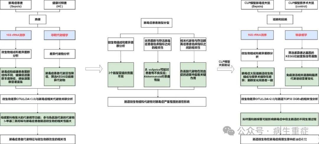 研究背景:膿毒癥是一種嚴(yán)重感染導(dǎo)致宿主劇烈炎癥反應(yīng)的疾病,是一種全球范圍內(nèi)危及生命的疾病。在某些情況下,膿毒癥會(huì)發(fā)展為多器官功能障礙綜合征,導(dǎo)致預(yù)后惡化。越來(lái)越多的證據(jù)表明,腸道菌群失調(diào)與膿毒癥等多種疾病的發(fā)病機(jī)制之間存在密切的相互作用。先前很多研究主要關(guān)注膿毒癥患者的微生物特征,但在膿毒癥中發(fā)生改變的細(xì)菌作用機(jī)制仍不清楚。膿毒癥的代謝特征已在血清中確定,但膿毒癥期間腸道的代謝變化尚不清楚。膿毒癥的代謝特征已在血清中確定,但期間腸道的代謝變化尚不明確。因此,為了闡明膿毒癥中腸道微生物群和代謝物的組成及其與疾病進(jìn)展的關(guān)系,我們對(duì)重癥監(jiān)護(hù)病房(ICU)收治的膿毒癥患者進(jìn)行了一項(xiàng)觀察性隊(duì)列研究。入院時(shí)收集的糞便樣本用于生成微生物和代謝譜。此外,我們還建立了膿毒癥大鼠模型,以反映腸道基因表達(dá)特征并驗(yàn)證患者的微生物特征。這項(xiàng)研究將揭示膿毒癥相關(guān)菌群的潛在生物學(xué)功能,為更早地預(yù)測(cè)和改善這種危險(xiǎn)疾病提供理論基礎(chǔ)。