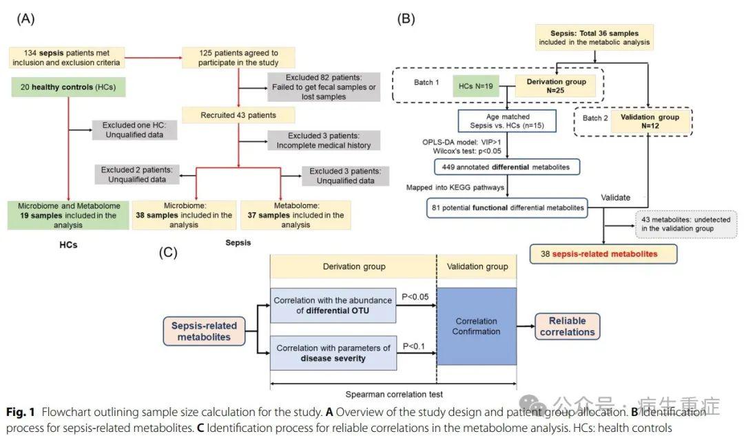 本研究為描述性觀察性研究,研究對(duì)象為來(lái)自中國(guó)一家中心(上海)的患者。膿毒癥的定義符合第三屆國(guó)際膿毒癥和感染性休克共識(shí)(spesis 3)的建議。排除患有絕癥的以及接受結(jié)腸造口術(shù)或回腸造口術(shù)的患者。經(jīng)過(guò)測(cè)序質(zhì)量過(guò)濾后,在微生物群比較中納入了38名膿毒癥患者和19名HC(圖1A)。對(duì)驗(yàn)證組的代謝組進(jìn)行單獨(dú)分析,僅在該組中檢測(cè)到的功能差異代謝物被確定為膿毒癥相關(guān)代謝物,只有在驗(yàn)證組中確認(rèn)的顯著相關(guān)性才被定義為可靠的相關(guān)性(圖1B、C)。