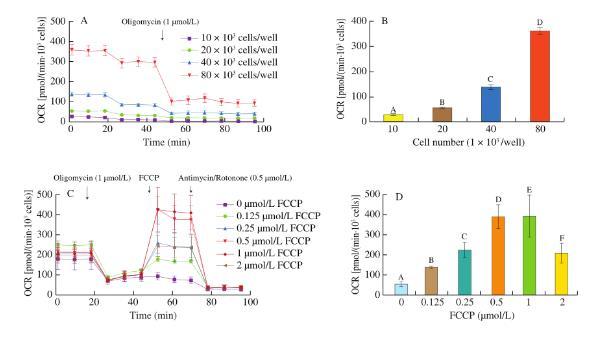 (A)不同細(xì)胞密度下DLD-1細(xì)胞的OCR;(B)不同細(xì)胞密度下的基礎(chǔ)呼吸速率;(C)FCCP梯度濃度(0、0.125、0.25、0.5、1、2μmol/L)處理DLD-1細(xì)胞的OCR;(D)梯度濃度FCCP處理細(xì)胞的最大呼吸速率