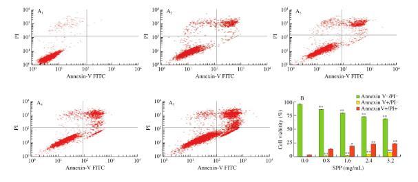 (A)DLD-1細(xì)胞用碘化丙啶(PI)染色,流式細(xì)胞法檢測,(A1?A5)SPP分別為0、0.8、1.6、2.4和3.2 mg/mL;