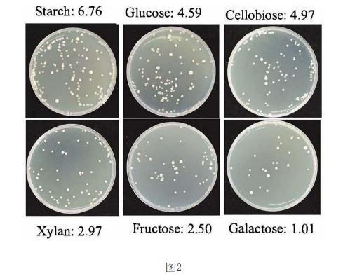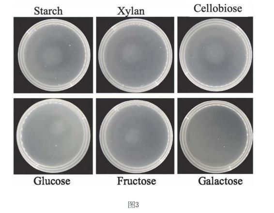 結(jié)果如圖3所示,以淀粉、木聚糖、纖維二糖、葡萄糖、果糖或半乳糖作為可代謝底物時(shí)形成了明顯的趨化圈,說明牛月形單胞菌可調(diào)節(jié)碳水化合物的趨化性。