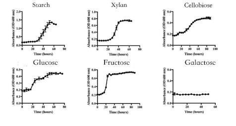 步驟4、利用常規(guī)細(xì)菌接種法進(jìn)行生化試驗(yàn):將活化至對(duì)數(shù)生長(zhǎng)中期的菌株以2%(v/v)的接種量接種于基本培養(yǎng)基MM中,分別以0.5%多糖(淀粉、葡聚糖、木聚糖、甘露聚糖、菊粉、地衣多糖、木葡聚糖)、0.5%二糖(纖維二糖、木二糖、甘露二糖)或0.5%單糖(葡萄糖、果糖、甘露糖、鼠李糖、半乳糖)作為唯一碳源底物,置于厭氧培養(yǎng)箱中于37℃條件下培養(yǎng);利用Bioscreen全自動(dòng)微生物生長(zhǎng)曲線測(cè)定儀連續(xù)測(cè)定80h,且每4h進(jìn)行一次OD600值測(cè)定,繪制可代謝碳源底物譜和生長(zhǎng)曲線,試驗(yàn)重復(fù)3次;生長(zhǎng)曲線如圖1所示,從圖中可以看出,以淀粉、木聚糖、纖維二糖、葡萄糖、果糖或半乳糖作為可代謝底物時(shí)有利于菌株生長(zhǎng)。