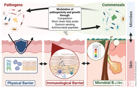 人體皮膚屏障的目的不僅僅是作為個(gè)體與其環(huán)境之間的物理邊界層。它是一個(gè)由細(xì)菌、古細(xì)菌、真菌和病毒組成的生態(tài)系統(tǒng)的家園。這個(gè)生態(tài)系統(tǒng)被概括為微生物組(圖1)。在皮膚上發(fā)現(xiàn)的典型的微生物包括酵母菌,如馬拉色菌;共生細(xì)菌,如桿狀桿菌科、表皮細(xì)菌科、鏈球菌科;以及凝固酶陰性葡萄球菌,包括表皮葡萄球菌、人型葡萄球菌和盧頓葡萄球菌。