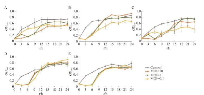 以未加噬菌體的細菌培養(yǎng)物作為對照,通過24 h內(nèi)測定OD595評估5株噬菌體不同MOI (10、1、0.1)的體外抑菌效果。K. pneumoniae BM327-1培養(yǎng)物OD595在12 h內(nèi)持續(xù)增加,以MOI為10的比例加入噬菌體pKP-BM327-1.2顯示出最好的抑菌效果,3 h內(nèi)完全抑制宿主菌株的生長(圖2A);具有同一宿主菌(K. pneumoniae M186-2) 的噬菌體pKP-M186-2.1和pKP-M186-2.2表現(xiàn)出不同的體外抑菌效果:噬菌體pKP-M186-2.1可持續(xù)抑菌3 h,且與感染復數(shù)未表現(xiàn)出相關(guān)性(圖2B),而以MOI為10的比例加入噬菌體pKP-M186-2.2后可以在6 h內(nèi)完全抑制細菌增殖,以MOI為1和0.1添加噬菌體時,前3 h曲線呈上升趨勢(圖2C),表明低劑量的噬菌體pKP-M186-2.2抑菌效果較差;噬菌體pKP-BS317-1.1和pKV-BS375-3.1具有相似的體外抑菌效果,2株噬菌體均可持續(xù)抑制細菌達6 h (圖2D、2E)。雖然5株噬菌體具有多樣化的體外抑菌效果,但由于噬菌體抗性突變菌株的出現(xiàn)及增殖,體外抑菌曲線均會在3 h或6 h后呈現(xiàn)上升趨勢。