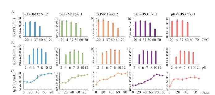 噬菌體一步生長曲線的測定發(fā)現(xiàn),噬菌體pKP-BM327-1.2和pKP-M186-2.1潛伏期最長 (20 min),噬菌體pKP-BM327-1.2在第70分鐘結(jié)束裂解期進入平臺期,而噬菌體pKP-M186-2.1裂解期持續(xù)60 min進入平臺期。噬菌體pKP-M186-2.2潛伏期小于10 min,在第60分鐘進入平臺期。噬菌體pKP-BS317-1.1潛伏期為10 min,在80 min時進入平臺期;噬菌體pKV-BS375-3.1潛伏期小于10 min,該噬菌體在50 min時進入平臺期。