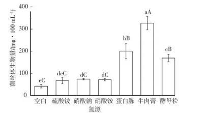 不同氮源對(duì)多形炭角菌菌絲體生物量影響如圖6所示。結(jié)果表明,多形炭角菌菌絲體在6種供試氮源培養(yǎng)基中均能生長,但不同氮源對(duì)菌絲體生物量的影響有差異,其中以牛肉膏為氮源的菌絲體生物量最高,達(dá)到327 mg/100 mL。無機(jī)氮源中,除硫酸銨組外,供試氮源與空白對(duì)照菌絲體生物量差異均顯著(P<0.05),但沒有達(dá)到極顯著水平(P<0.01)。