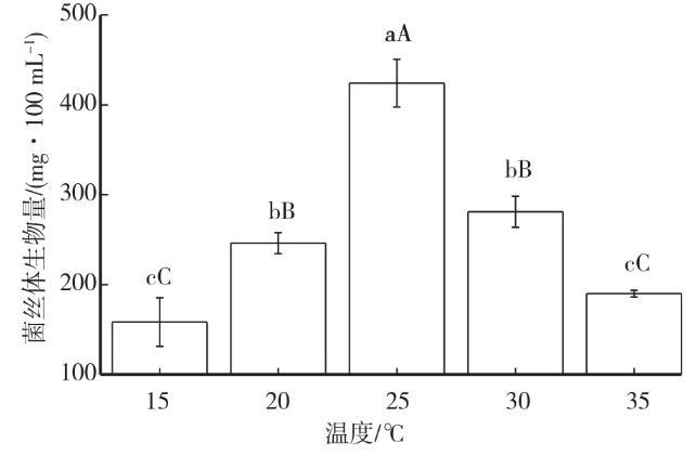 不同溫度對(duì)多形炭角菌菌絲體生物量影響如圖9所示。培養(yǎng)溫度15~25℃,隨著溫度的上升,菌絲生長速度加快,于25℃時(shí)菌絲體生物量最高,達(dá)到424 mg/100 mL,與其他溫度相比均達(dá)到極顯著水平(P<0.01)。因此,最適培養(yǎng)溫度為25℃。