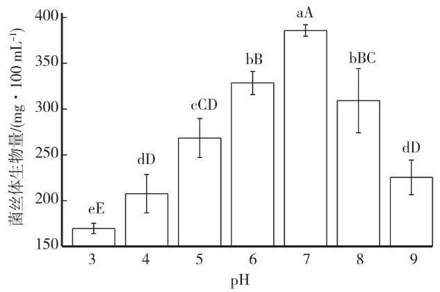 不同pH對(duì)多形炭角菌菌絲體生物量影響如圖8所示。結(jié)果表明,多形炭角菌菌絲體在供試pH為4~9的培養(yǎng)基都能生長。培養(yǎng)基在pH 7時(shí)菌絲體生物量最高,達(dá)到386 mg/100 mL,pH 3時(shí)菌絲體生物量最低,為169 mg/100 mL。培養(yǎng)基pH偏酸或偏堿時(shí),都不適宜菌絲體生長。因此可將pH 7選為多形炭角菌菌絲體液體發(fā)酵培養(yǎng)的最適pH。