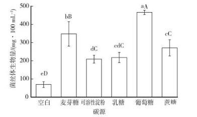 不同碳源對(duì)多形炭角菌菌絲體生物量影響如圖5所示。該菌株在5種供試碳源中均可生長,表明該菌株菌絲對(duì)單糖、雙糖及多糖均能利用,但菌絲長速和長勢存在差異。該菌株以葡萄糖作為碳源時(shí)菌絲生物量最大,達(dá)到466 mg/100 mL,且與其他碳源相比,差異顯著(P<0.01)。因此,葡萄糖為菌絲生長的最佳碳源。