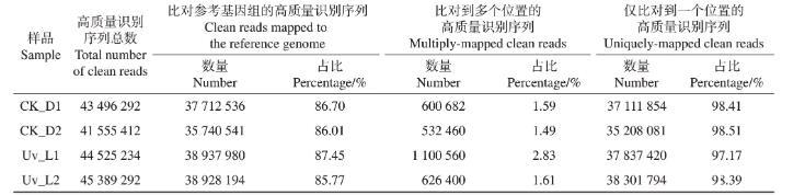 為了從轉(zhuǎn)錄組水平探究照光抑制ZJ09菌株菌絲生長的機(jī)制,本試驗構(gòu)建了4個cDNA文庫(CK_D1、CK_D2、Uv_L1和Uv_L2),其中,文庫CK_D1與CK_D2為黑暗組的2個重復(fù),文庫Uv_L1與Uv_L2為照光組的2個重復(fù)。文庫質(zhì)檢合格后進(jìn)行高通量測序。測序數(shù)據(jù)經(jīng)整理、過濾后,共獲得6G數(shù)據(jù)量的高質(zhì)量序列,達(dá)到轉(zhuǎn)錄組測序?qū)?shù)據(jù)深度的要求。最終的序列數(shù)量、堿基數(shù)量以及識別準(zhǔn)確率見表2。從中可以看出,高質(zhì)量識別序列占比及高質(zhì)量識別序列堿基占比均大于97%。